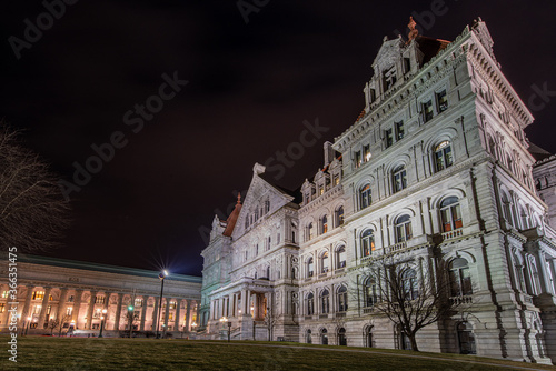 © Philip, Fototapeta premium North entrance to granite and red roof New York State Capitol building at night with state Education Department building in the background.