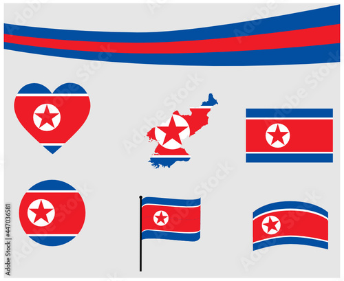 Naklejka premium North Korea Flag Map Ribbon And Heart Icons Vector Illustration Abstract National Emblem Design Elements collection
