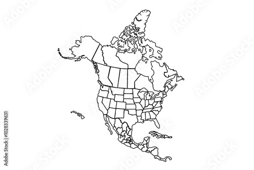 Fototapeta premium Northern America vector map contour silhouette illustration isolated on white background. line art vector illustration, line drawing map.