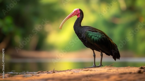 Naklejka premium Northern Bald Ibis in natural setting, Full view with glossy feathers on sandy riverbank, Unique bald head against river backdrop, Critical for studying endangered species