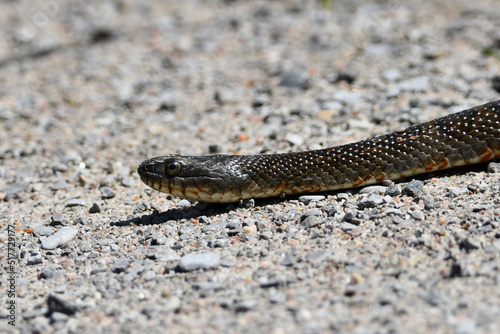 Fototapeta premium Northern Common Water snake slithering across gravel road