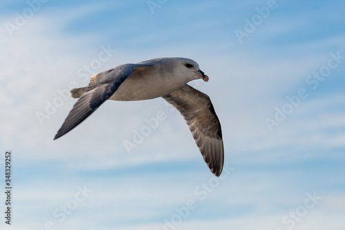 © Alexey Seafarer, Obraz premium Northern Fulmar flying above Arctic sea on Svalbard.
