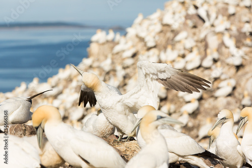 © lisalouise, Fototapeta premium Northern Gannet (Morus bassanus) displaying, wing shaking and sky pointing, at breeding colony, Bass Rock, Scotland, United Kingdom