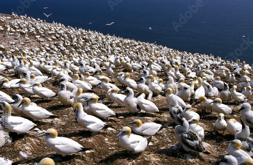 © slowmotiongli, Fototapeta premium NORTHERN GANNET sula bassana, NESTING COLONY, BONAVENTURE ISLAND IN QUEBEC