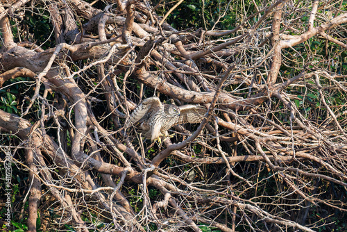 Obraz premium 飛翔する美しいオオタカ(タカ科) 英名学名:Northern Goshawk (Accipiter gentilis, family comprsing hawks) 東京都大田区東京港野鳥公園-2025年