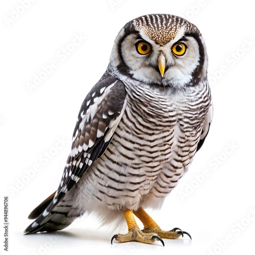 © muhammad, Fototapeta premium northern hawk owl full body portrait of a tawny owl looking at the camera, isolated on white background