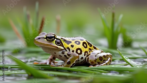 © sarifah, Fototapeta premium Northern leopard frog on green wet grass field