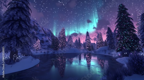 Naklejka premium Northern Lights Above a Snowy Holiday Forest