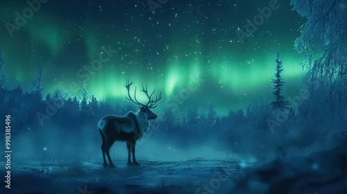 © wicha, Fototapeta premium Northern Lights and Wildlife: Design a scene featuring Arctic wildlife, such as reindeer or wolves, under the mesmerizing glow of the Northern Lights.
