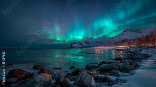 © Arieswanto, Fototapeta premium Northern Lights dance over icy fjord with Arctic winter wonderland.
