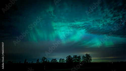 Naklejka premium Northern lights dancing behinde the dark clouds over country landscape