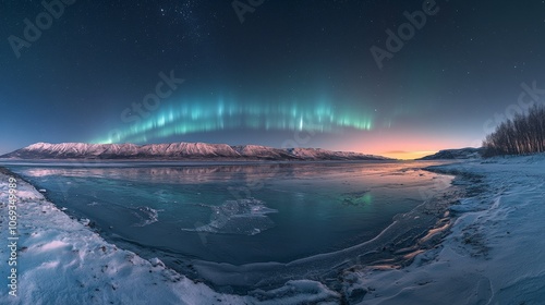 © gen_pick, Naklejka premium Northern Lights glowing above snow-covered mountains and beach landscape
