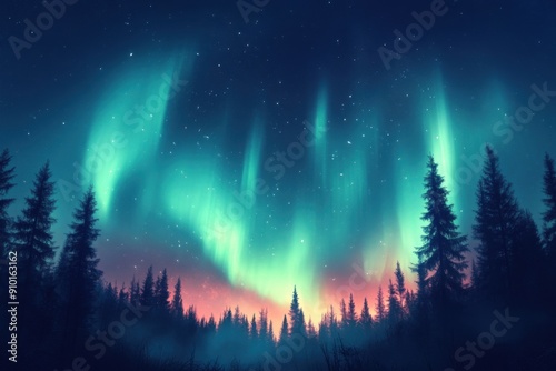 © Papukos, Naklejka premium Northern Lights illuminating pine trees beneath a starry sky