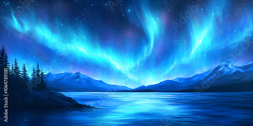 © muhammad, Fototapeta premium Northern Lights Over a Tranquil Lake and Mountains
