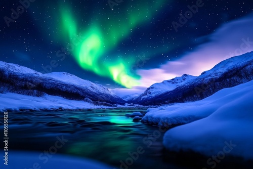 Naklejka premium Northern Lights Over Snow-Covered Mountains and River Under a Starry Night Sky