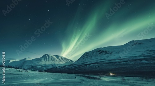 © bulegendut, Naklejka premium Northern Lights Over Snowy Mountains