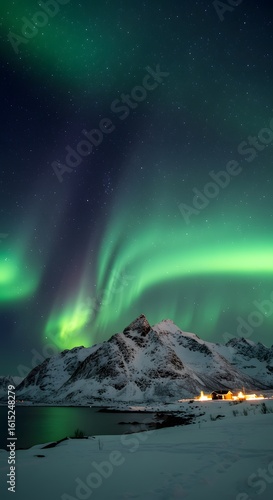 © Abderrazzak, Naklejka premium Northern lights over snowy mountains, starry sky, peaceful vibe