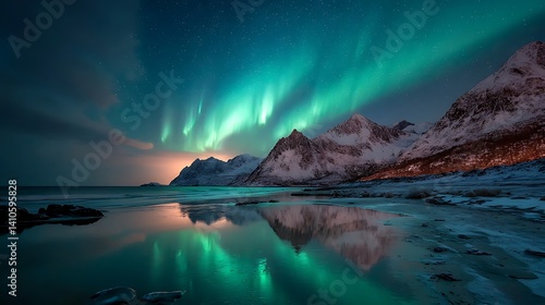 © goodskin, Naklejka premium Northern Lights reflecting on a calm winter beach