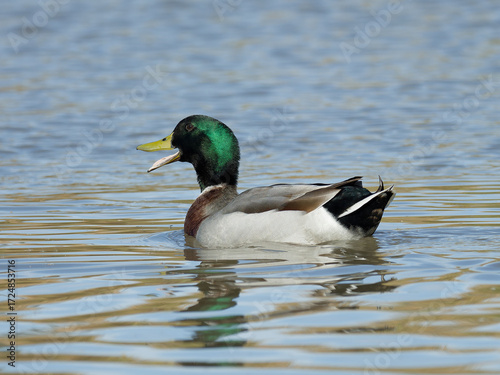 Fototapeta premium Northern Mallard (Anas platyrhynchos) swimming in a lagoon with bill open...
