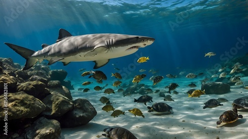 Obraz premium Northern River Shark and River Turtles: Coexisting in a Peaceful Freshwater Ecosystem