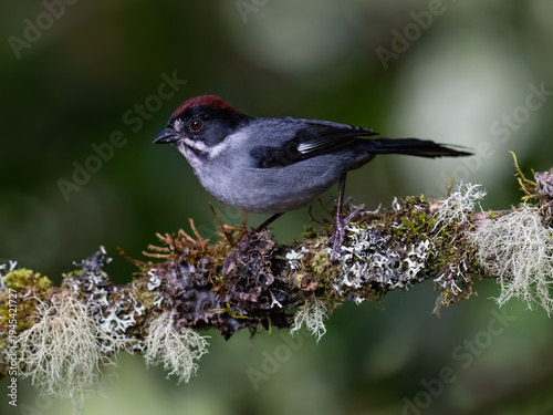 © FotoRequest, Obraz premium Northern Slaty Brushfinch Perched on Mossy Branch in Cloud Forest