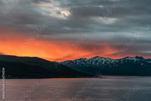 Fototapeta premium NORWAY, RINGVASSOYA - JULI 25, 2020 - spectacular sunset over Ringvassoya,...