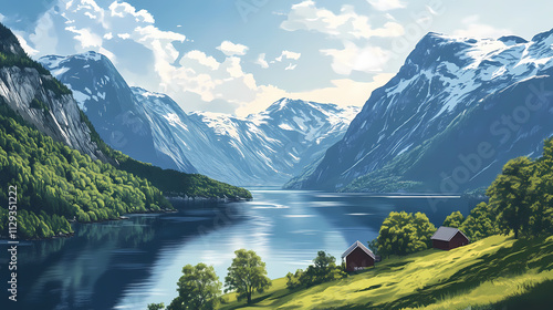 © Thiago, Fototapeta premium Norwegian fjord and mountain landscape, beautiful scenery. Fjord. Illustration