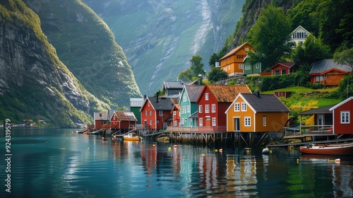 © Sumet, Fototapeta premium Norwegian fjord valley, colorful wooden houses, towering cliffs, serene waters, traditional fishing boats, crisp morning air