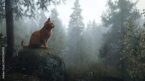 © saadamjadartworks, Fototapeta premium Norwegian Forest Cat Perched on a Tree in a Forest
