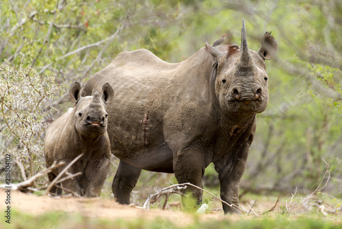 © JAG IMAGES, Naklejka premium Nosorożec czarny, samica i młode, Diceros bicornis, Park Narodowy Krugera, RPA