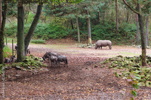 © julia700702, Naklejka premium Nosorożec szuka pożywienia między grupą gnu w zoo