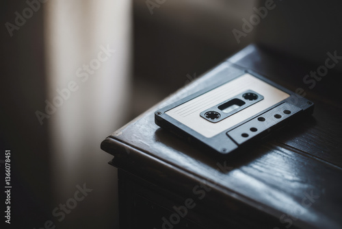 Fototapeta premium Nostalgic Retro Cassette Tape Resting on Wooden Surface Bathed in Soft...