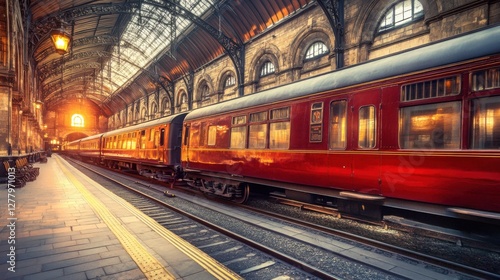 © Asraf, Fototapeta premium Nostalgic Train Station Interior at Sunset with Vintage Carriages and Beautiful Architecture