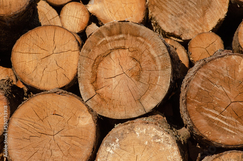 © Aritel, Naklejka premium Not chopped round firewood stacked in a pile, wooden texture