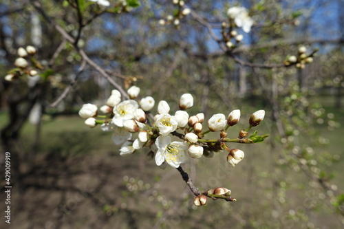 © Anna, Obraz premium Not fully opened white flowers of plum tree in April