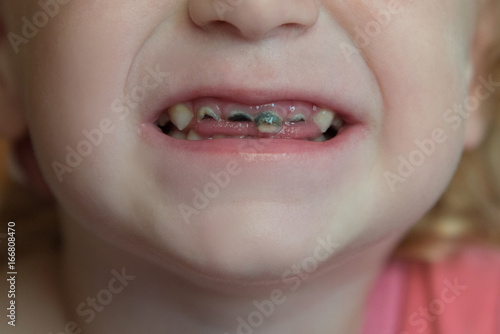 © Oksana Bessonova, Naklejka premium Not healthy baby's front teeth with black caries