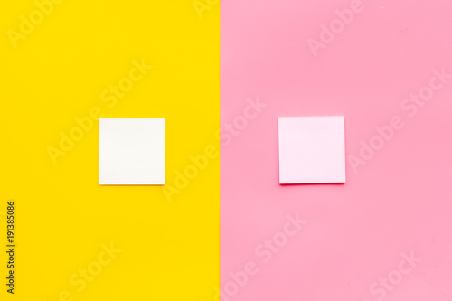 Fototapeta premium Note paper on pink and yellow background top view copy space