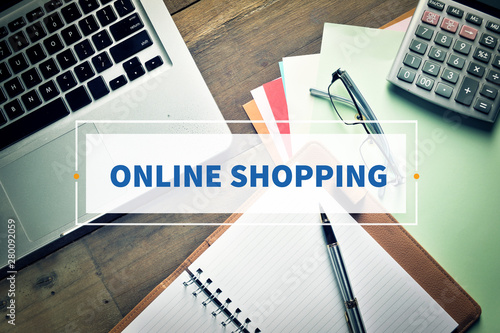 © shahrilkhmd, Naklejka premium Notebook and Laptop with text ONLINE SHOPPING