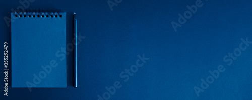 © Ksenia, Obraz premium notebook on a spring and a pen on a black background. space for text. banner. toned classic blue color
