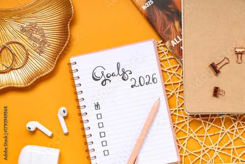 Fototapeta premium Notebook with 2026 goals, earphones and accessories on orange background