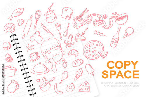 © paitoonpati, Fototapeta premium Notebook with kid girl hand drawing set, Imagine of Future Occupation "Chef" concept idea illustration isolated on white background, with copy space