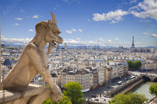 © Jose Ignacio Soto, Obraz premium Notre Dame: Chimera (demon) z widokiem na Wieżę Eiffla