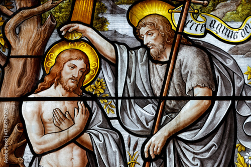 © Godong Photo, Fototapeta premium Notre-Dame de Beaune basilica. Stained glass. The baptism of Jesus by John the Baptist. Beaune. France.