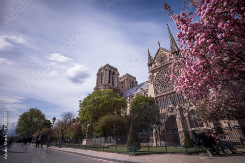 Fototapeta premium Notre Dame de Paris. France. Ancient catholic cathedral on the quay of a river Seine. Famous touristic architecture landmark in spring
