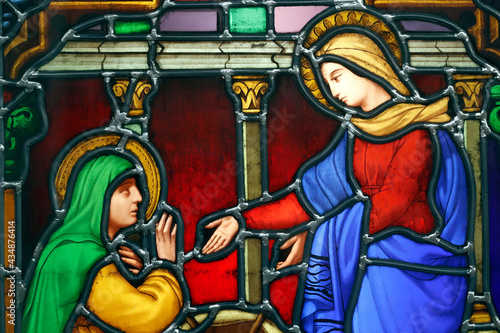 © Godong Photo, Obraz premium Notre Dame ( our Lady ) d'Aix les Bains church. Stained glass window. The Visitation of Virgin Mary is the visit of Mary with Elizabeth as recorded in the Gospel of Luke. Aix les Bains. France.