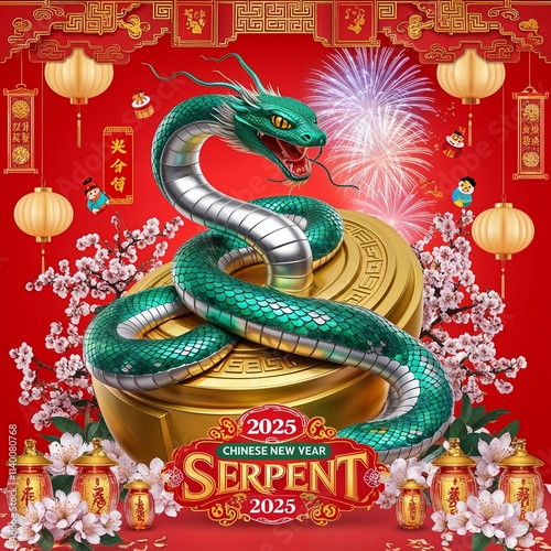 © ADESIGN, Obraz premium Nouvel An Chinois 2025 - Année du Serpent, célébration traditionnelle avec symboles festifs et culture chinoise, décorations, serpent mythique et motifs inspirants pour projets visuels