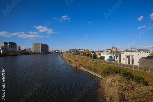 © solution, Obraz premium Nov 30 2023 City skyline at dawn with blue sky and water reflection