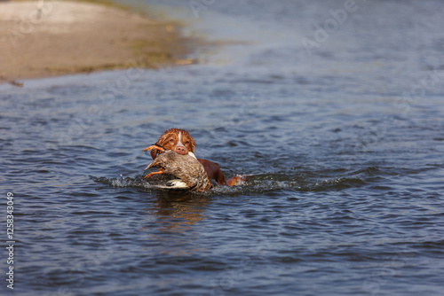 Fototapeta premium nova scotia duck tolling retriever with duck