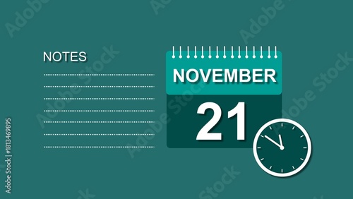 © MD SHAHIN, Fototapeta premium November 21 Calendar white color 4k illustration, with Free for Notes and Writing element. Deep cyan background 4k illustration.