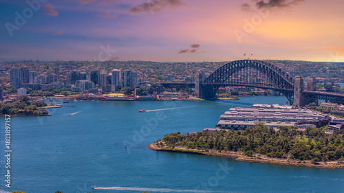 © Elias Bitar, Naklejka premium 18 November 2025 Panoramic night view of Sydney Harbour and City Skyline of NSW Australia beautiful colourful skies on a beautiful spring day